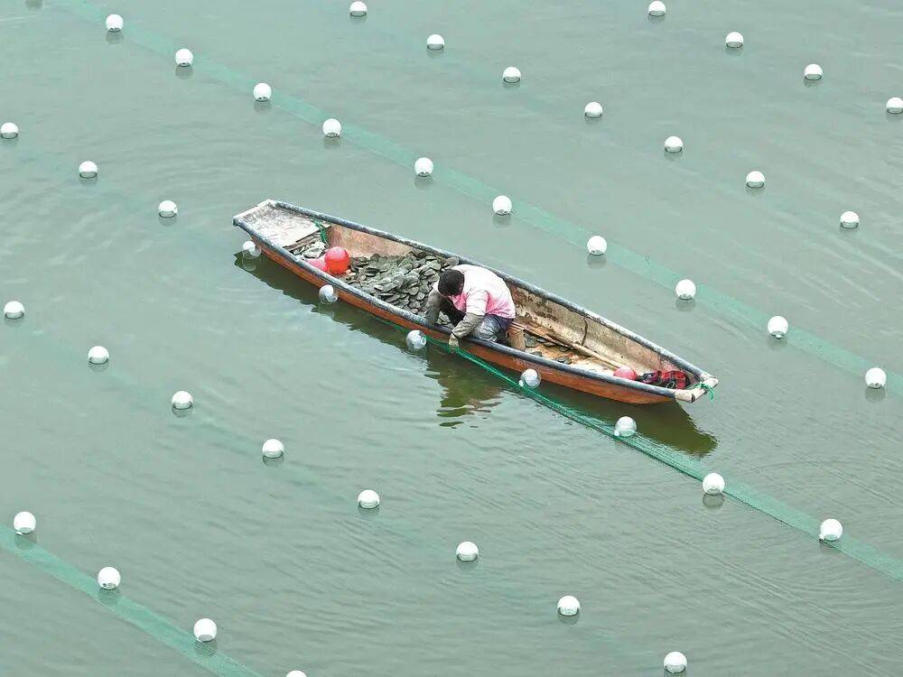 1月29日,记者走进山下湖镇新长乐村,跟随村民乘船驶入珍珠蚌塘深处。在水面上的养殖浮球旁,记者俯身提起连接浮球的绳索,沉甸甸的网兜刚离水面,网兜内一只只饱满肥硕的珍珠蚌轻轻开合,让人不禁好奇蚌中藏着怎样的璀璨珠光。