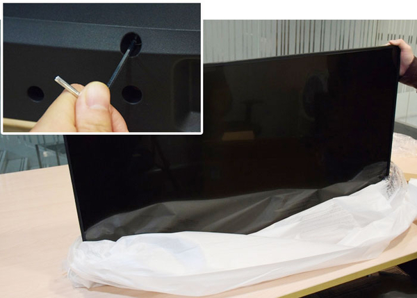 这款电视的附件中自带金属杆,可以用来很方便的安装底座。共3个配件,除了两个支架之外,其它东西统一放在了一个小盒子里。