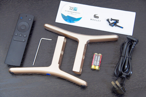 打开配件盒子,可以看到满满一小盒的工具和配件,分别是说明书一份、遥控器1个、电池1对、螺丝5颗、螺丝刀1把、电视电源线一根。值得一提的是微鲸电视的贴心配备,5颗螺丝,其实电视底座只需4颗。